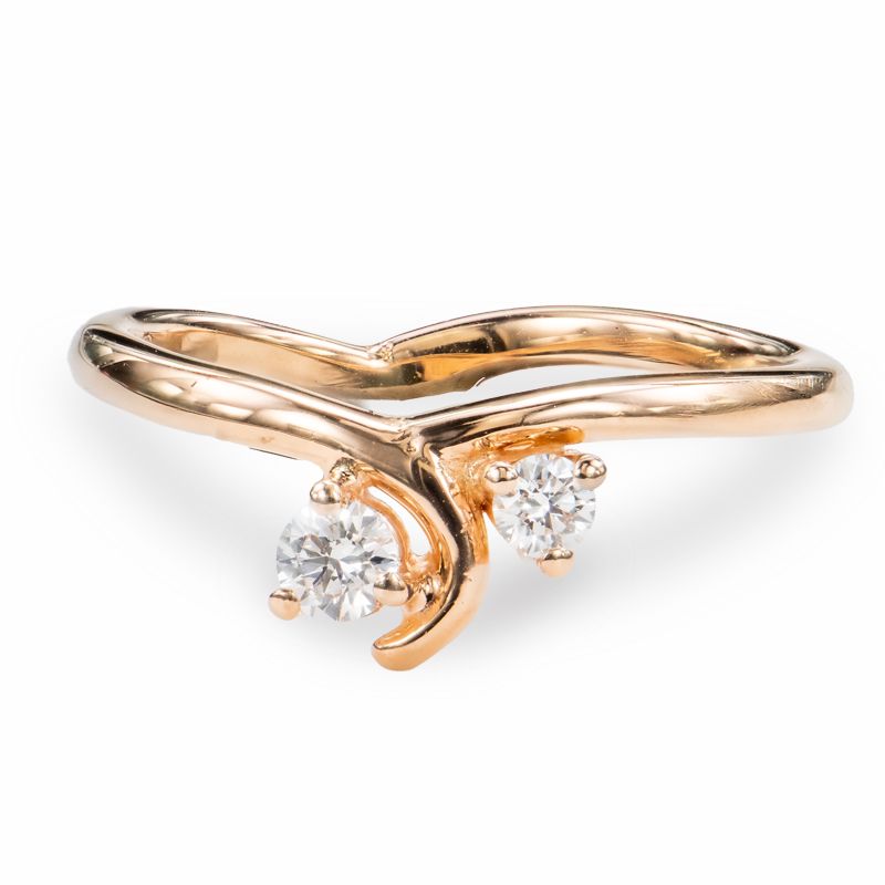 Het is een tijdje stiller geweest rond rosé goud maar we krijgen terug meer vraag naar deze kleur. Vandaar de creatie van deze rosé gouden 18 kt (verlovings)ring gezet met 2 diamantjes. De ring is zodanig opgebouwd dat er eventueel een trouwring naast kan gedragen worden.